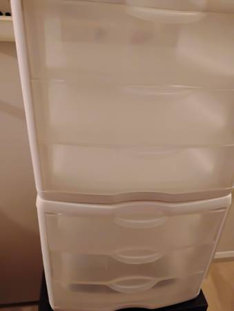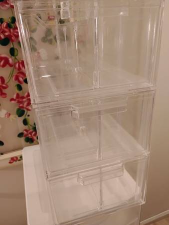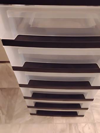 Great for office or home 1 black plastic container 6 drawer with organizer top $10 2 white 3 drawers each $5 3 container store clear drawers $10