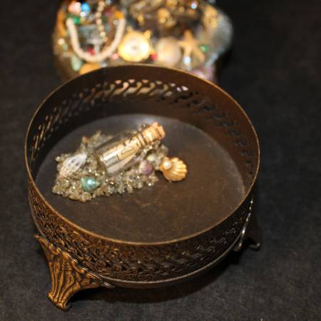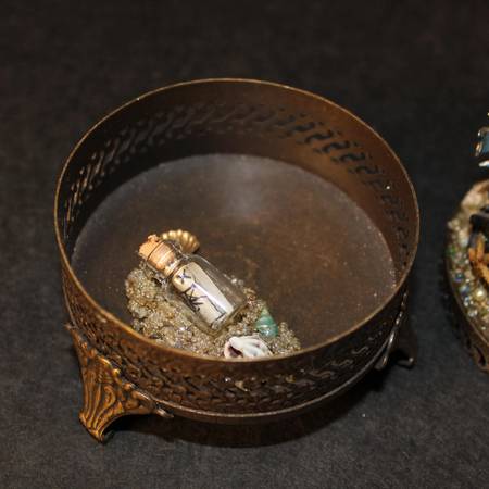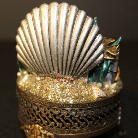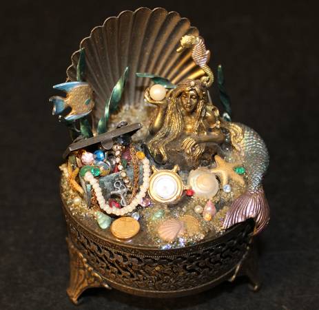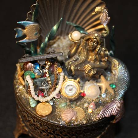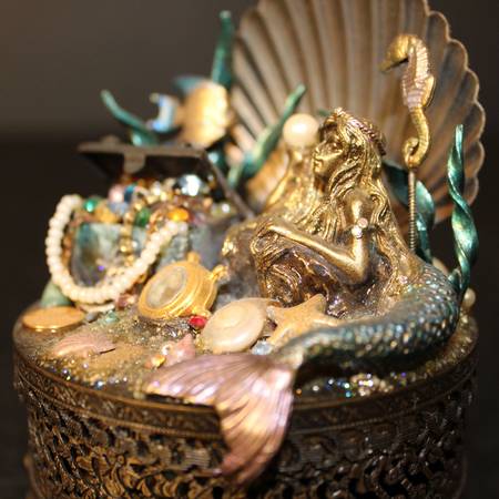 Intricately crafted mermaid-themed trinket box featuring a treasure chest, gold coins, pearls, and a sculpted mermaid resting in a glittery undersea scene.