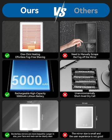 【Rechargeable Shower Shaving Mirror】Built-in 5000 mAh rechargeable lithium battery. A single charged lasts about 2 weeks.(including charging cable, excluding charger).