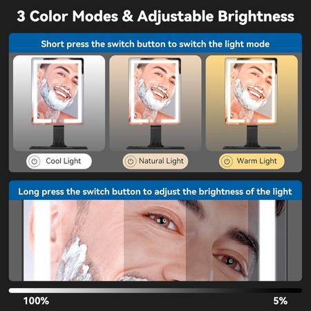 【3 Color Modes & Adjustable Brightness】 This mirror for shower wall has Cool, Natural and Warm 3-color lights. Short press the switch button to switch the light mode, long press the switch button to adjust the brightness of the light. Lighting memory function design can keep the light settings of your last use when you turn on the mirror next time.