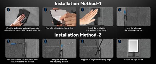 【Easy to install and versatile】: Please tape the wall mount to a dry, clean, smooth surface. This mirror for bathroom comes with two razor holders and a collapsible storage shelf for shave gel or others.