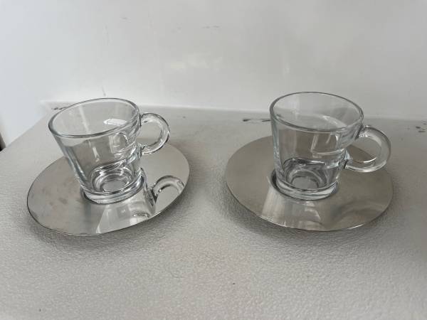 cute pair nespresso brand espresso clear glass cups & two-tone matte polished stainless steel saucers gently used condition
