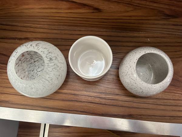 excellent used condition, no chips or cracks, all solid no drainage holes cute extra small 1 glass & 2 ceramic multi-use decorative pots vases candle holders trinket dishes makeup brushes pens...