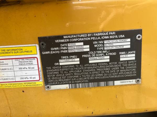 2020 Vermeer BC700XL, Only 454 Hrs., Ready to Work! Call Chris