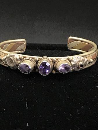 Amethyst cuff bracelet with 3 good size amethysts and 1 very small garnet.