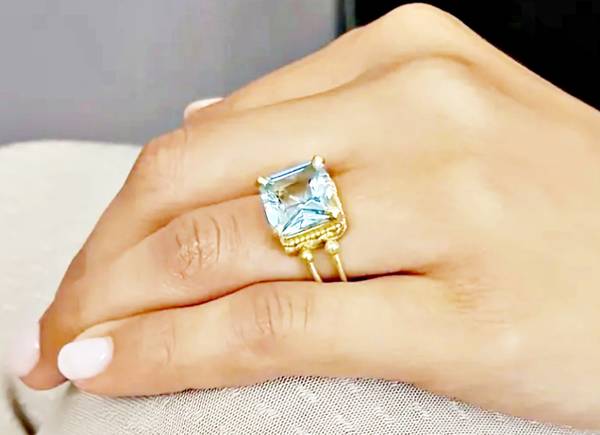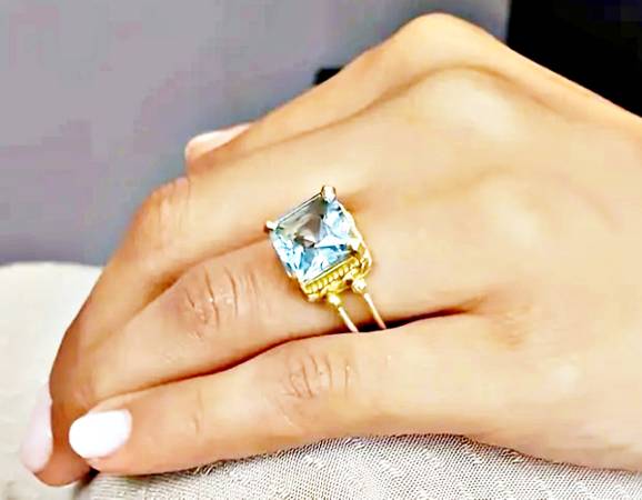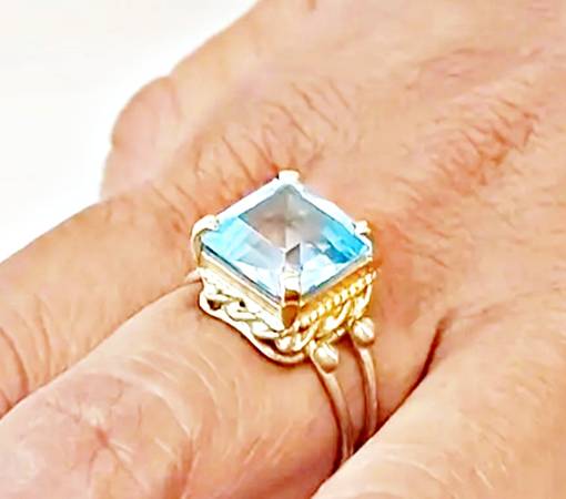 SQUARE SEMI PRECIOUS CULTURED Aquamarine 10 Carat Prong Setting Solitaire Style Stainless Steel Gold Tone Ring Double Base Roman Style Size 8