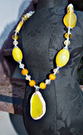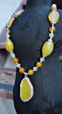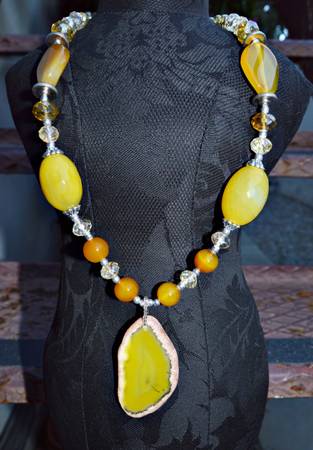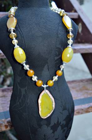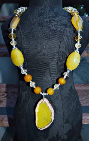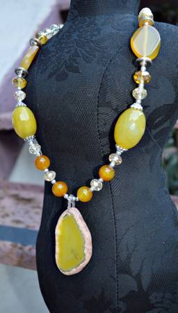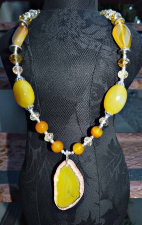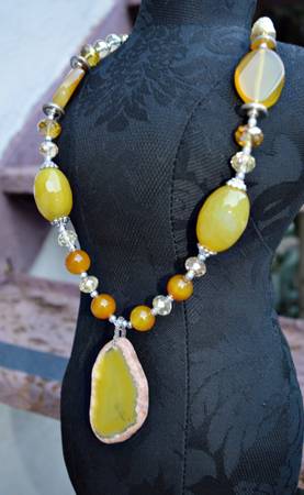WOMEN'S NECKLACE WITH SLICE PENDANT HANDMADE INCREDIBLY BEAUTIFUL AGATE YELLOW & ORANGE GEM BEADS & SLICE PENDANT 13'' LENGTH 2.5'' PENDANT 25mm BEADS