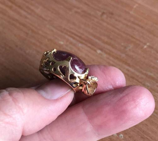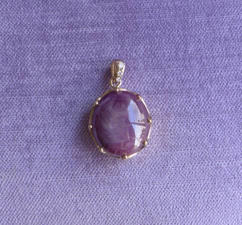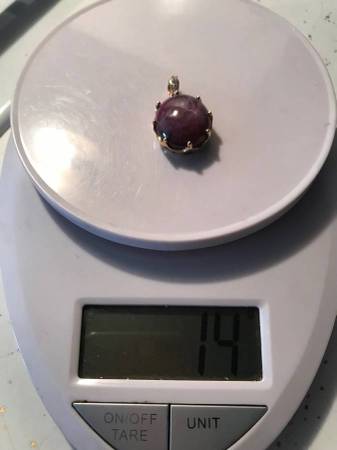 This large star ruby is 14g and has 3 diamonds on the gold bail and very sweet hearts all around the outside of the stone in the gold. This pendant is from my mother's estate and I have no other information on it.