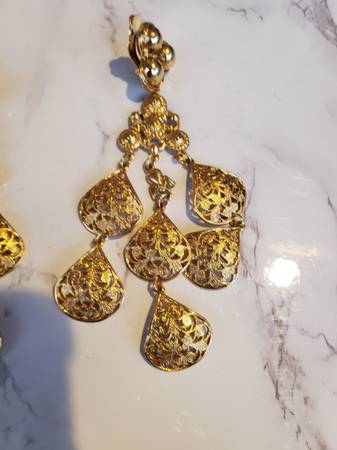Elegant gold filigree drop clip earrings with intricate design. I have lots more costume jewelry both clipped and pierced. Contact me through craigslist email