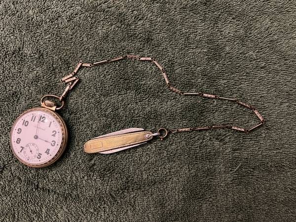 ANTIQUE BOULEVARD SWISS S16 17J POCKET WATCH W/ CHAIN & KNIFE FOB, RUNNING