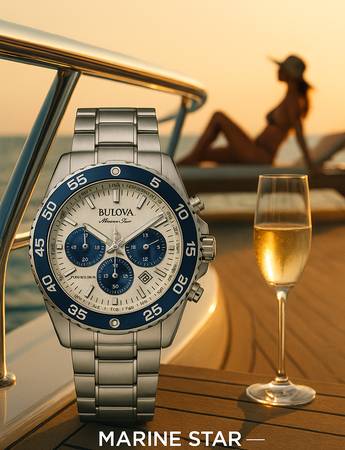 This Bulova Marine Star chronograph captures the spirit of the ocean and the precision of fine engineering. A stainless-steel body meets a deep blue rotating bezel and silver sunburst dial, accented...