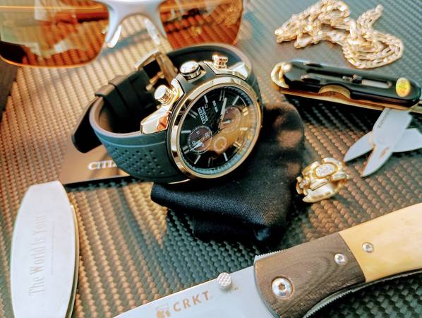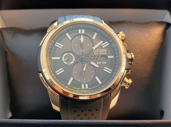 Citizen Eco-Drive Gold/Black Chronograph – The Apex of Power and Precision ⚡ Some watches whisper. This one growls. With its deep matte-black dial framed by rich gold accents, this Citizen Eco-Drive...