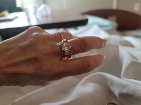 Vintage ring size 6, 18kt gold plated over stainless steel. 18kt 1gm is about $97vgm. Keeps going up.Going up. 3 oval stones CZ man made diamond. ZALES is pricing CZ in 14 kt gold almost as if diamonds. There is little base metal, not significant in value. 18kt gold 102 gram. Will be $5,000, possibly by end of year$120 gram by end of year. You have designed & 3 CZs.
