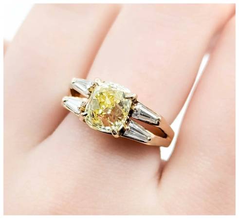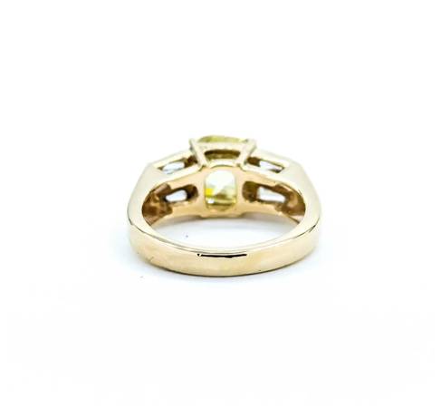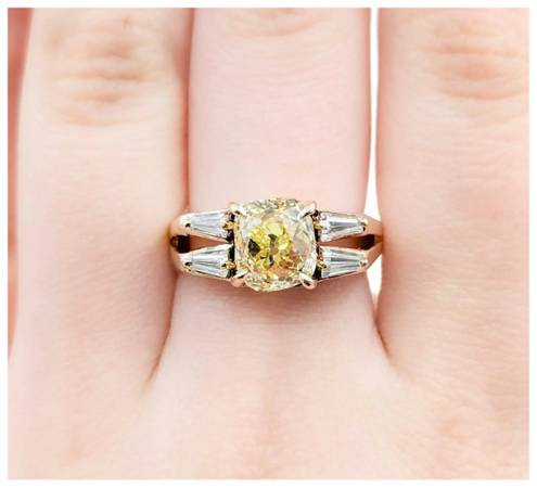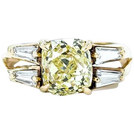 This ring is crafted in 14k yellow gold and features diamond. The Old Mine Cut diamond weighs 3.02ct, Fancy Yellow with SI clarity.