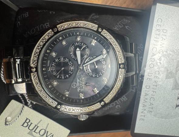 Selling a men’s Bulova Marine Star 98E003 – a sophisticated, luxury timepiece featuring diamond accents and a stunning black mother-of-pearl dial. This watch blends bold styling with functional design, perfect for everyday wear or special occasions.
