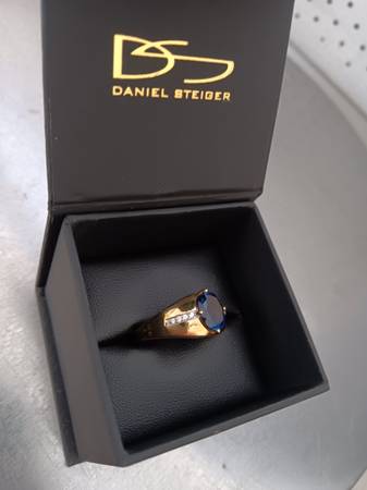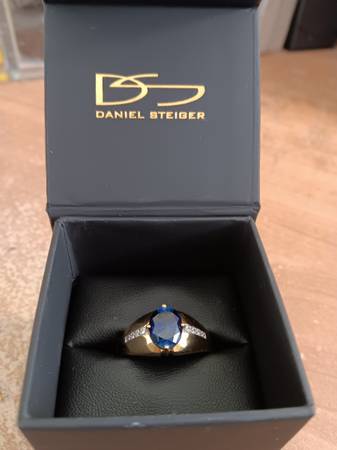 MEN'S STERLING SILVER RING PLATED IN 18K YELLOW GOLD WITH 2CT OVAL CENTER SUNTHETHIS BLUE SAPPHIRE WITH .10CT CZ ON SIDES LIKE NEW SIZE 14