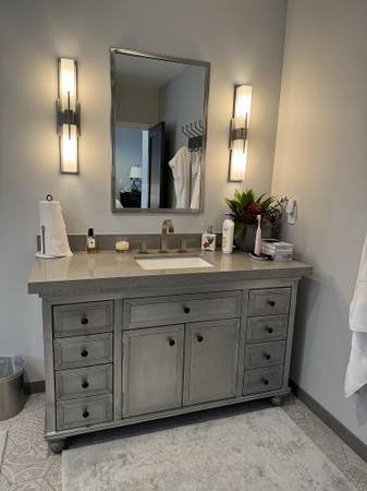 SOLD **Art Deco Style Glass Rod Bath Sconce - Add a touch of vintage glamour to your bathroom with our Art Deco Style Glass Rod Bath Sconce. The sleek, geometric design and polished nickel finish bring a sophisticated and timeless style to any space. The frosted glass rods add a soft and warm glow, creating a relaxing and inviting atmosphere for your bath or vanity area - 2 available, $240 each