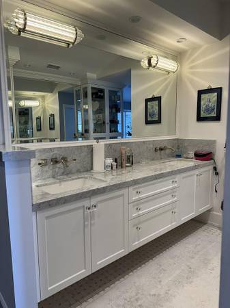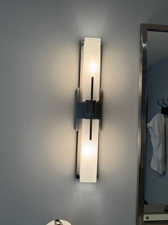 SOLD**Possini Euro Midtown Satin Nickel Modern Bath Sconce - A transitional style satin nickel bath bar light fixture from the Possini Euro Design collection with beautiful white glass. (retail $280ea). Dimensions: 23 1/2" wide x 4 1/2" high. Extends 4 1/2" from the wall ; Backplate is 7 1/2" wide x 4 1/2" high. Uses two maximum 60 watt T10 tube bulbs - 2 available, $110 each