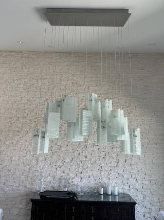 SOLD**Modern Artisan Glass Linear Chandelier - Handmade artisan glass modern chandelier - 20 halogen lights surrounded by custom blown glass plates on adjustable wires. Excellent condition. Paid $7500. Measures: 36w x 58h - $2200