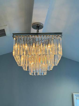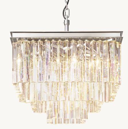 SOLD **Restoration Hardware 1920's Odeon Square Chandelier 22" - Polished Nickel - Inspired by the Art Deco style of 1920s Paris, our collection from Timothy Oulton captures the period's fascination with geometric forms. Masterfully refracting the light, hundreds of faceted, dynamic prisms evoke the allure of the era. Hanging like lush fringe from a welded iron frame, the angular glass juxtaposes elegance and industrialism. Excellent condition- Retail $5200 Chandelier Body: 21¼" sq., 22¼"H; Minimum Height: 26½"; Maximum Height: 95"; Canopy: 6" diam., 1"H - $2200