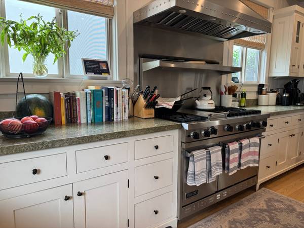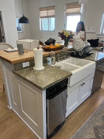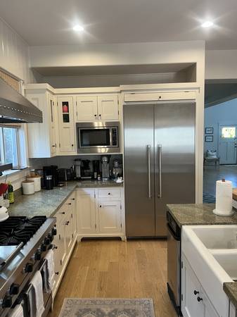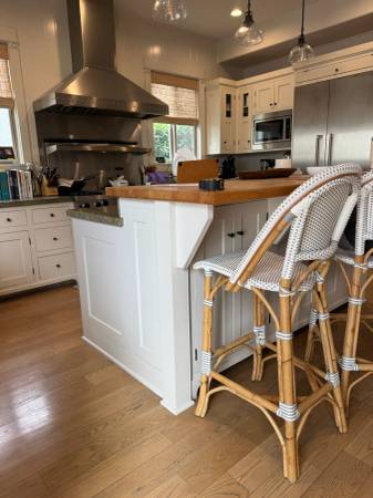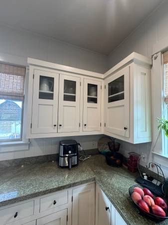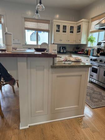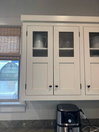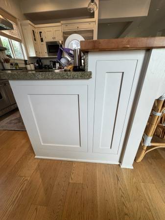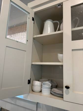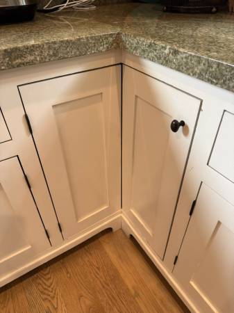 Custom made Shaker Style inset cabinets. White melamine inteiriors, adjustable shelving, (2) lazy susans- white melamine full extension drawer glides. Very good condition. Some evidence of wear on...