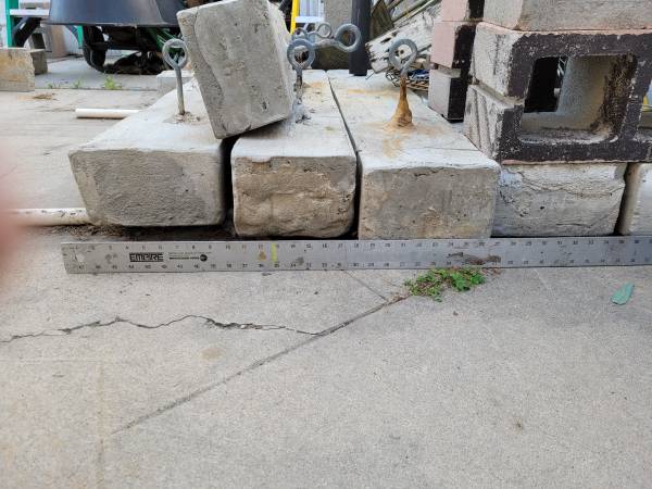 These were used as heavy weights for laminating foam to plywood, but have many other uses like temporary weights for tents, displays, swap meet booths, mudslide control, or their original use for laminating materials where clamps are impractical. They weigh about 75 to 80 lbs. and can be moved by two men with a bar thru the eyebolts. 48" long X 8 1/2" wide x 5 3/4" high
