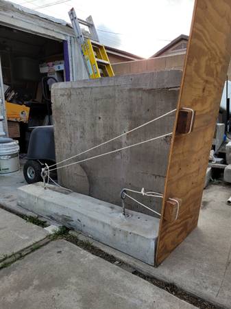 These have lots of added concrete, made much heavier than regular car stops (@$35 w/ no eyebolts). I have 12 available, (minimum order is 3). 3 could support a 16' long barrier about/over about 20" high. Contingent on you purchasing the rebar, and sheets of plywood, and some bolts, and assembly and installation,
