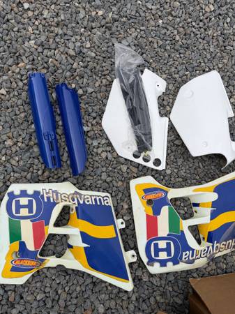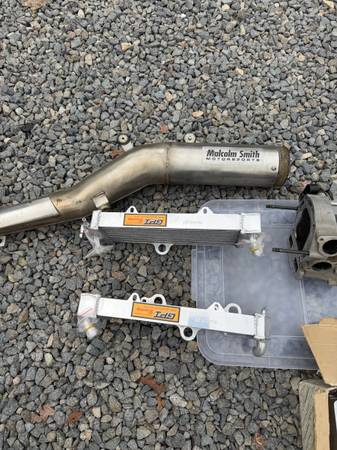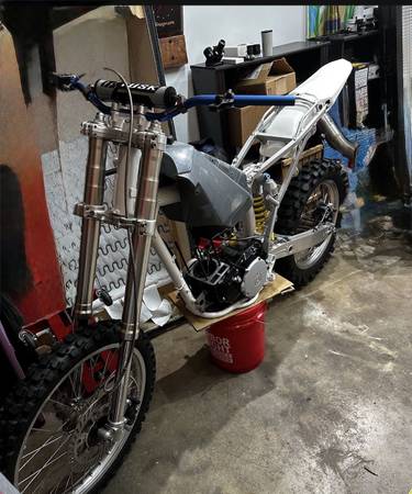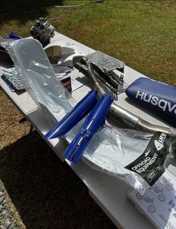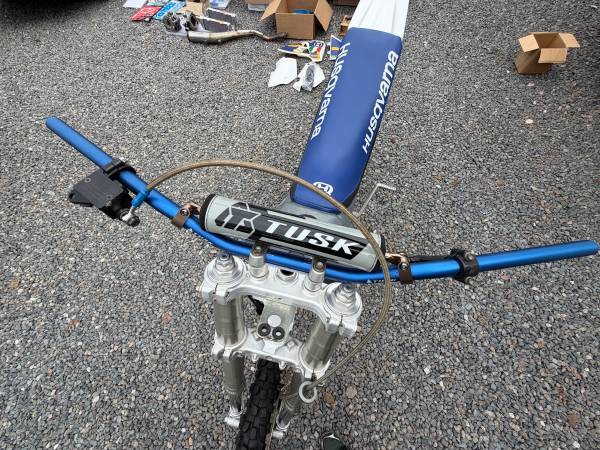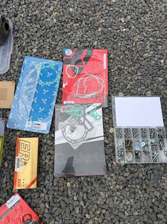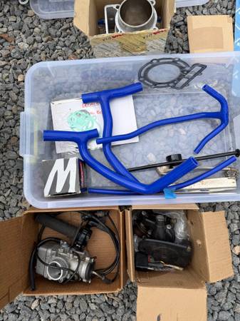 Some examples of new parts: new bearings throughout suspension and frame, handle bars, tires, wheel bearings, sprockets, engine bottom end fully rebuilt with new seals and bearings (and painted) + NEW cylinder, new piston, etc. All other parts including fuel tank, carburetor, plastics, decals, seat (with new seat cover), etc all included