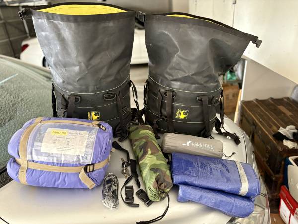 Included are two disc locks (one with alarm), a one man tent, tarp, sleeping bag, pair of heated gloves, two pairs of summer gloves, glove liners, fuel bottle, siphon hose, Carbon Ultralite tubeless tire repair kit, bungee cords and straps, perforated summer riding coat and pants (Joe Rocker Rocket Girl size L) with cooling vest and cooling bandana, Bilt ballistic over-pants (size XL), TCX waterproof boots (size 9 men), BILT ankle length boots (size 10 women).