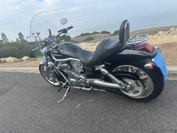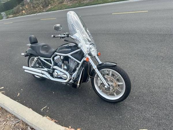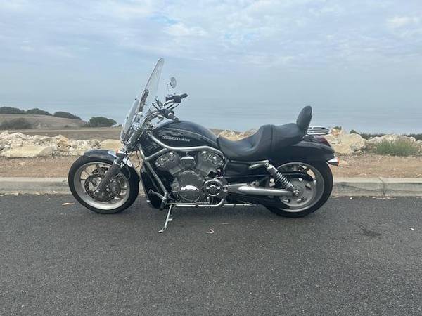 Well maintained VROD with only 14K original miles. This 2006 VROD is the VRSCA model which has the mag style wheels and the silver frame which IMHO is the best looking VROD in the HD lineup. This black beauty has many creature comforts installed including a HD VROD touring seat, touring passenger pillion, passenger backrest, rear fender luggage rack and a full-size quick release HD windshield for those days when you have to ride on the freeway. Additional chrome items include the lower front forks, headlight visor and the handlebar mounted front brake and clutch fluid reservoir covers. Performance upgrades from Vance & Hines include a high flow air filter, performance slip on headers and an electronic Fuel Pak giving this VROD added power and a brawny sound. Also included are the owner’s manual, Vance & Hines Fuel Pak literature, two HD keys with alarm FOBS and two black his (size L) and hers (size S) HD half helmets. This VROD has a clear California title and current California license and registration.