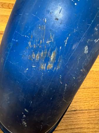 An original front fender from six decades ago. Pretty good shape. Has a million little scratch marks and a slight bump with a scuff.