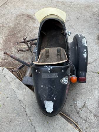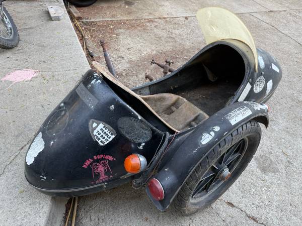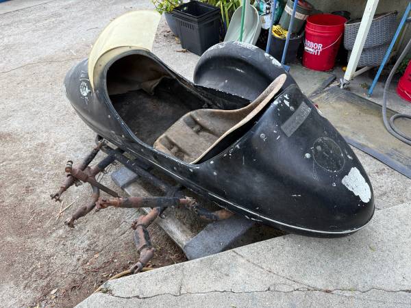 California Sidecar Companion sidecar kit. Fiberglass and steel. Made in the USA. Circa 1970's. Rare and complete universal sidecar kit with Mag wheel. Sidecar, bsa, honda, harley davidson, norton,...