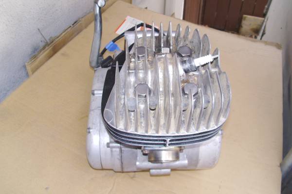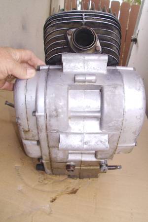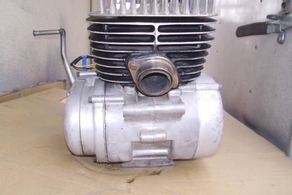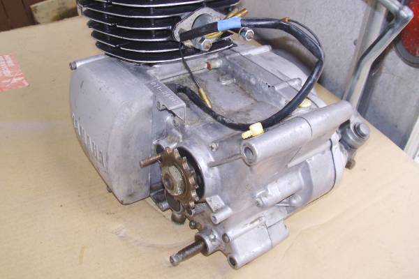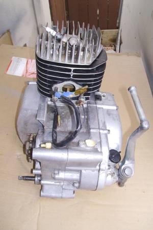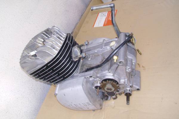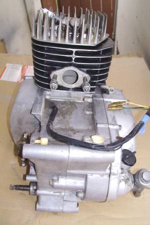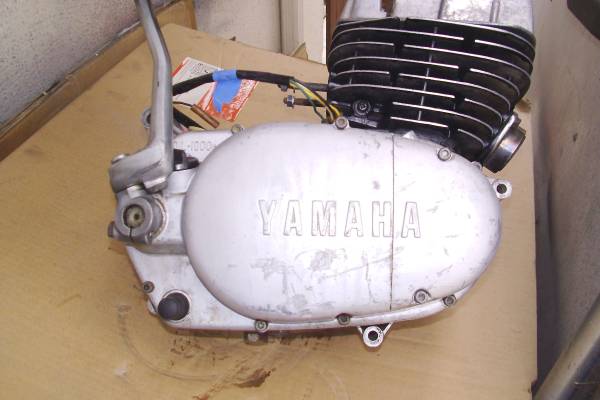 250cc two-stroke engine and 5-speed transmission from 1969 Yamaha DT1 in very good condition. Strong compression, excellent spark, recently rebuilt top end. No cracks, chips, or damage anywhere. VIN # DT1-26043. This engine was started and run in September, just prior to removal from the bike.