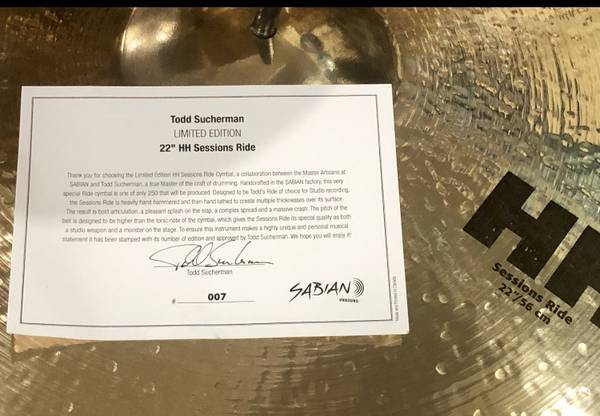 Todd Sucharman 22" HH sessions Sabian ride Limited edition #007 NO trades price is firm Local pick up LAX Hawthorne areas Here is Todd explaining it. https://fb.watch/dDaI_2IgJr/...
