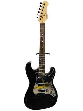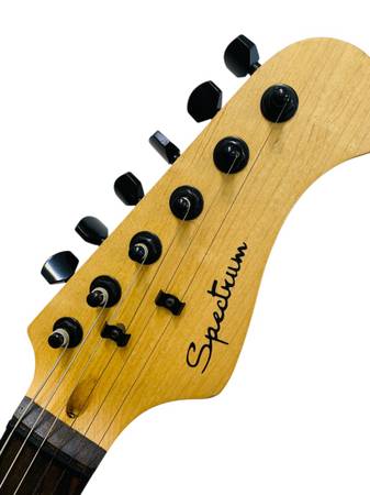 Description: Pre-owned Spectrum 6-String Electric Guitar in Black with Mirror finish. The guitar comes with a case, strap, and a few guitar picks. It shows some cosmetic wear including hairline scratches and a small chip on the front. One screw was overtightened, causing a crack in the clear material, and a few screws are missing. The pickups feel slightly loose, but with some minor repairs, the guitar should play like new. A great project piece or affordable starter guitar for those willing to do a bit of maintenance.