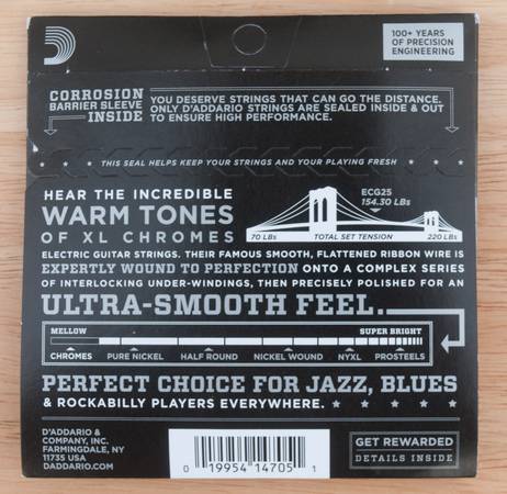 New unopened D'Addario Chromes light gauge (12/52) flat wound guitar strings. [1] available. Selling for half of retail cost.