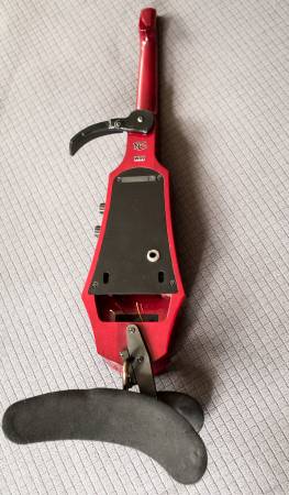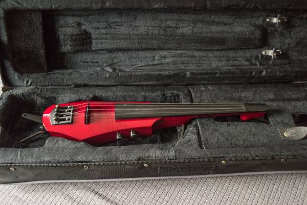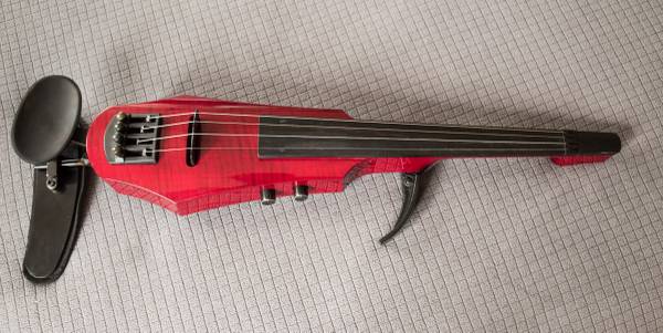 This NS Design electric violin is transparent red maple. It is used and in very good condition: ready to play. Neck is also maple and the fingerboard is ebony. The removable body reference bout is adjustable and removable. The fully adjustable shoulder/neck rest can be