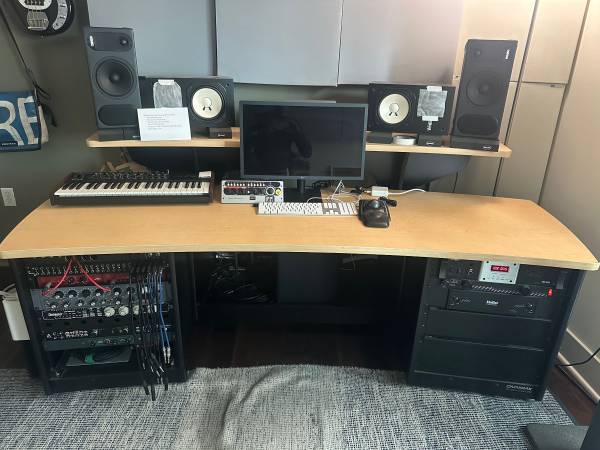 Selling my desk and finally downsizing to something much more fitting for my current workflow as I no longer produce. This thing is so great, well built, and having it on wheels is so helpful. Comes with the keyboard tray, though I typically have it removed. The only blemish is the binding coming up slightly, see picture. The rest of the desk is near immaculate.