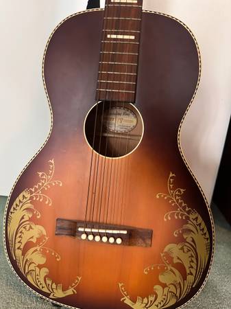 Selling my Recording King Dirty 30s 7 Limited-Edition “Lily of the Valley” acoustic guitar in Tobacco Sunburst finish. This is a beautifully made Single 0 body guitar with a hand-painted Lily of the Valley floral design on the top – a unique collector’s piece that also sounds fantastic.