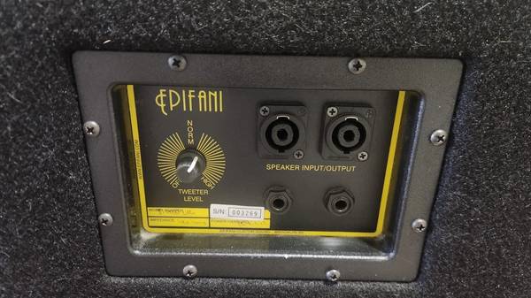 Epifani T 410 UL bass guitar cabinet with 4 10" speakers. Low end farts out at high volumes. Will need repair. High end sounds nice and crisp. Sold as is. Very good cosmetic condition. Missing front...