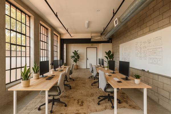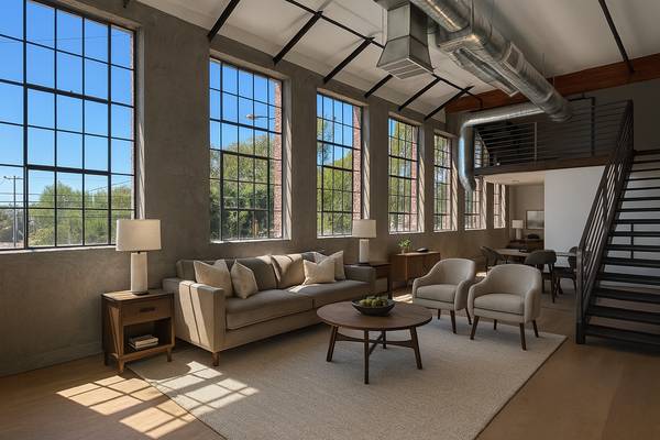 β’ Massive industrial windows flooding the space with daylight