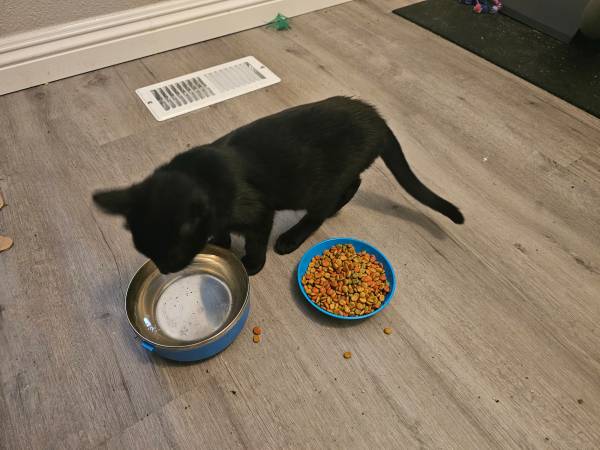 Very loving and playful kitten with green eyes for family, approx 10 weeks old. I named her midnight. I just don't have the time to give her the attention she deserves due to my work schedule. She comes with a litter box and a collar with small bell. Small rehoming fee. Only 1 available. Near the Torrance area. Call show contact info