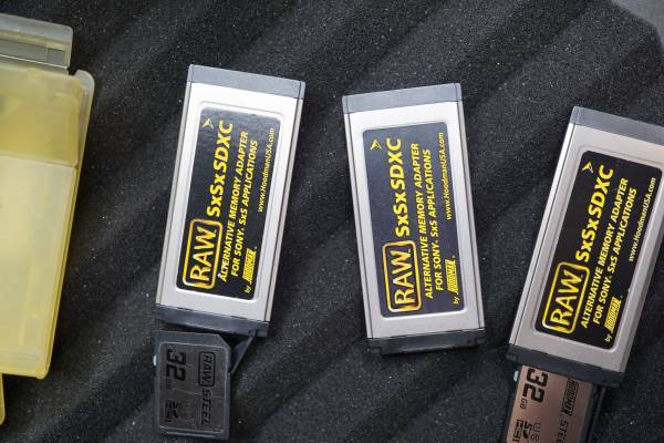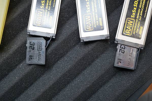 (2) RAW SxSxSDXC memory card adaptors (hoodman/RAW steel) w/32GB cards