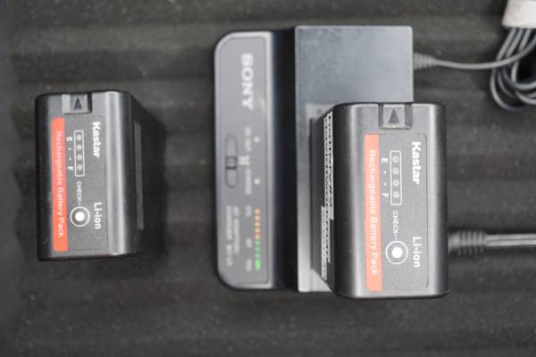 (2) Kaster rechargablevcamera batteries 14.4V 5800mAh 83.6Wh and (1) SONY charger (BC-U1)