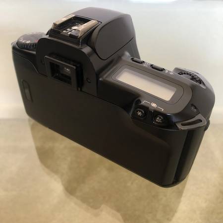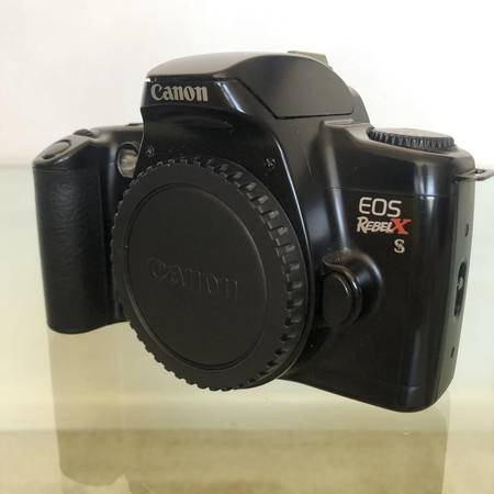Classic Canon EOS Rebel Xs 35mm film camera body in black. Great for vintage photography enthusiasts, includes original body cap and instruction manual.