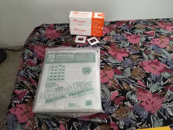 50+ 'Easymounts' 2"x2" 35mm slide holders, slides storage sleeves and misc items.