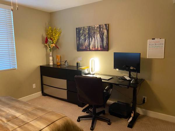 This is a contemporary tastefully decorated condo with stainless steel appliances, granite countertop, washer/dryer combo in unit, fireplace, recessed lighting, hickory hardwood floor in living room, modern bathrooms with modern fixtures and great floor plan. You will get your own private room and attached bathroom, and share kitchen and living room with me. Tandem parking available in a garage with attached EV charger. The building has a small gym for the residents use.