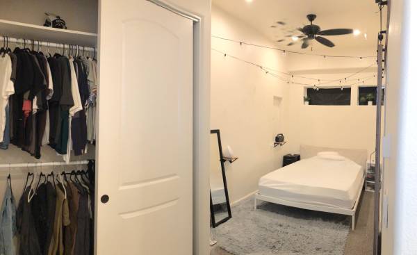 * Room S: Cozy room with a private bathroom, ceiling fan, closet. This room comes with a bonus flex space that can be used as a private living room, yoga / exercise room, den or office.
