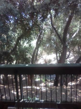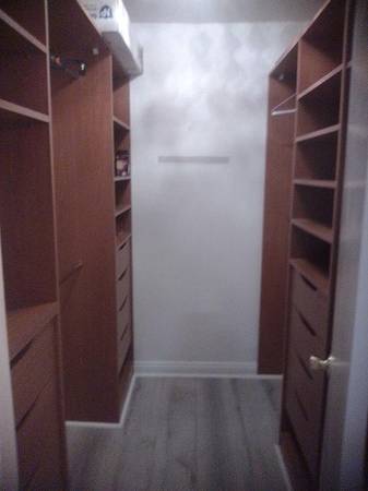 Unfurnished master bedroom with ensuite bath in upgraded condo. Walk-in closet with multiple built-in drawers. Beautiful oak trees, tranquil creek in front of unit. In-unit laundry, fireplace, pool, jacuzzi, lake, gym.
