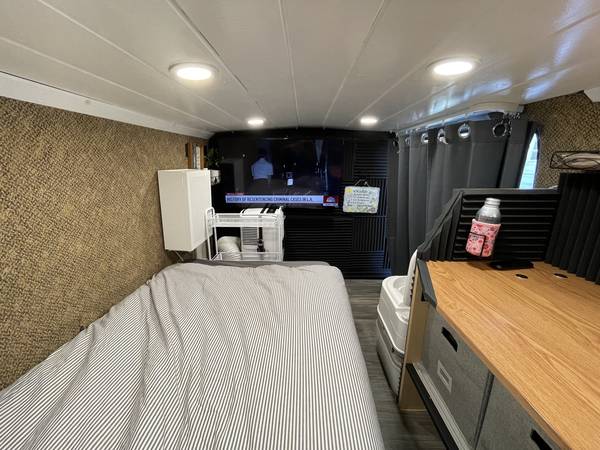 - Storage: slide-out clothing bins under desk, white metal storage shelf, 3x in wall shelfs, 3x in-wall bottle holders, towel racks, more storage under bed
